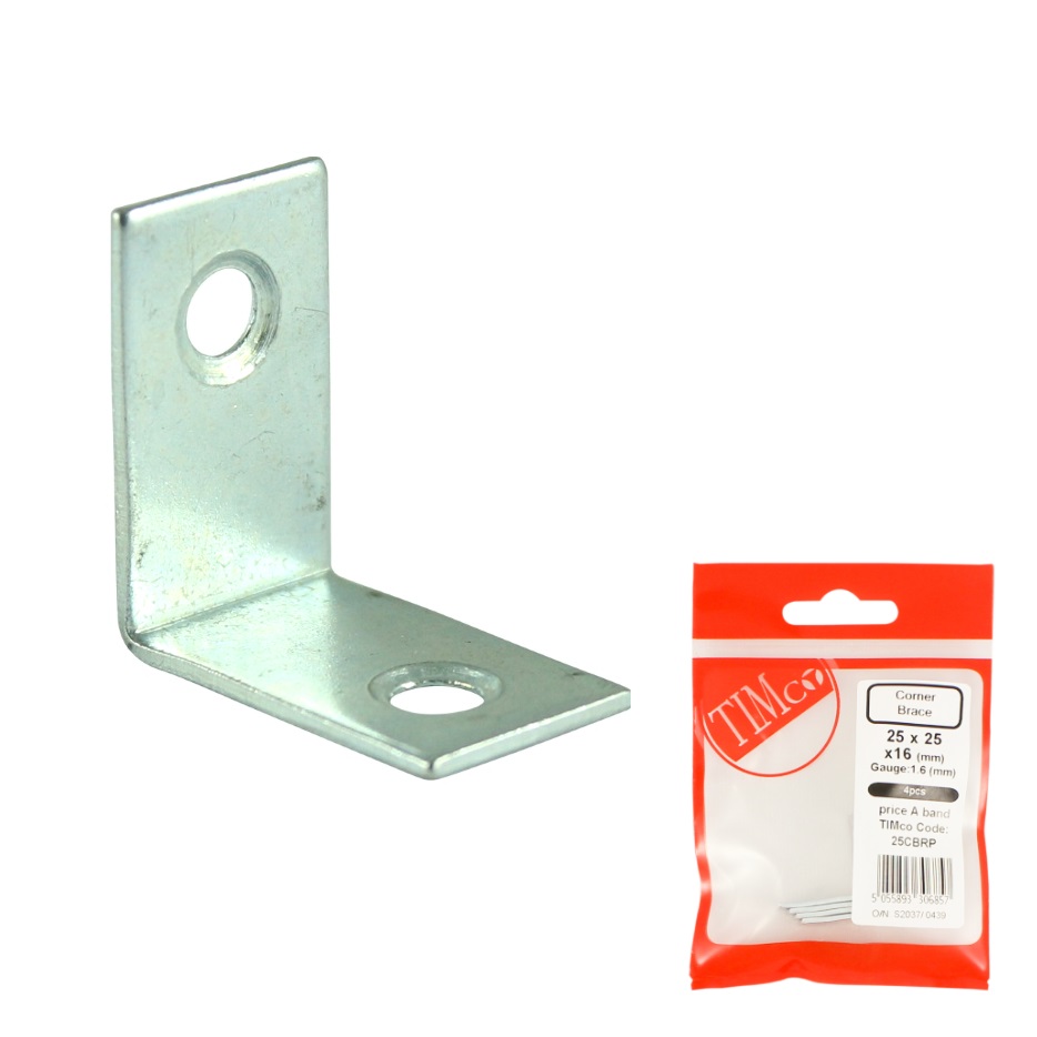 Zinc plated steel corner braces supplied in a pack of 4 pieces. Used for strengthening inside corners, features countersunk holes for a flush finish.